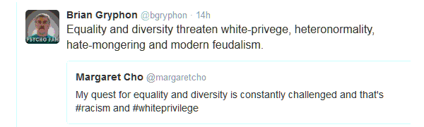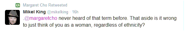 This post is a follow up to some tweets posted last night; by me as well as some done by, or shared by, Margaret Cho. I can not speak for Margaret (and she does very well speaking for herself) or ‘all women’ or people of colour. For that matter, I can’t speak for other white folk; only address my own experiences and observations. Check out About Me page to know about where I’m coming from.