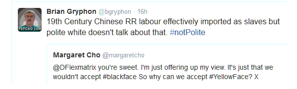 Margaret asked “why can we accept #YellowFace?” To those who don’t immediately understand that term, yellowface is a white person putting on make up and portraying a person of Asian heritage. It is, as Margaret notes, similar to blackface. It seems clear to me that yellowface is not, nor should be, less offensive.