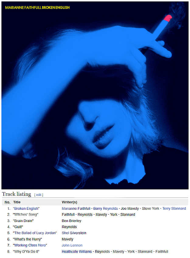 The first of her albums that I heard was Broken English. My then-partner had it when we met in 1980. I don’t have it now, but many of the same tracks (see the image here for the track list; click it for a larger version) are on the 1994 release Faithfull: A Collection of Her Best Recordings which I do have. Along with the 2008 Easy Come, Easy Go and her latest; She Walks In Beauty; see the second image.
